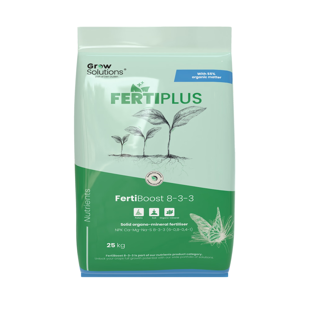 FertiBoost 8-3-3, voorheen bekend als FertiPlus 8-3-3, is een unieke organo-minerale meststof die speciaal ontwikkeld is om een gezond bodemleven te ondersteunen en planten optimaal te voeden. Dankzij de uitgebalanceerde samenstelling bevordert deze meststof zowel de bodemstructuur als de groei en weerbaarheid van jouw gewassen.
